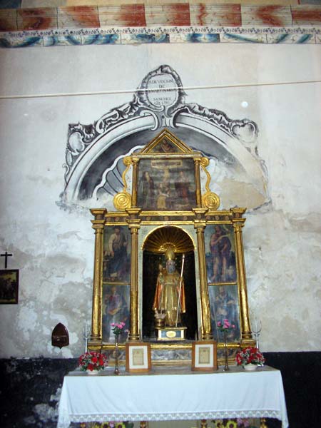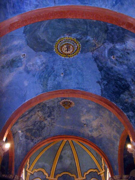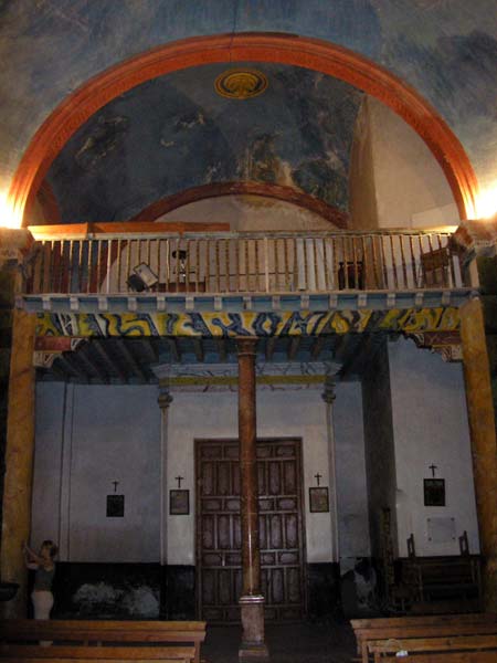 Toda la iglesia se encuentra decorada con pinturas murales. Las bóvedas en tonos azules que, con las filtraciones de agua de lluvia, forman manchas, como nubes, en tonos gris-azulado, como un verdadero cielo. Todas las columnas, al igual que las molduras de las cornisas, están policromadas imitando revestimientos de mármol. El entramado de vigas de madera que forma el forjado del coro, especialmente las ménsulas y la viga de apoyo, están policromadas en época reciente.