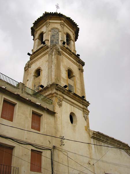 El primer cuerpo integrado a la fachada, como único hueco presenta un óculo de forma elíptica. El segundo cuerpo con cuatro fachadas enmarcadas por pilastras, en las que se abren huecos bajo arcos de medio punto, enmarcados en diferentes molduras de yeso. En el tercer y último cuerpo se sitúa propiamente el campanario. De las ocho fachadas, en cuatro de ellas se abren huecos, también bajo arcos de medio punto. Y en las otras cuatro, alternas, estos huecos se simulan, con un revoco en tono oscuro. Fachadas y huecos quedan enmarcados en pilastras, cornisas y otras molduraciones, realizadas en yeso, en tonos ocres.
