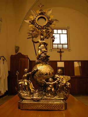 Las Virtudes Teologales constituyen el pie y el astil. Las esculturas de bulto de la Esperanza provista de un áncora y la Caridad como matrona, alimentando a dos niños, flanquean un globo terráqueo que forma el gollete, sobre el que descansa la Fe, que a modo de astil, monta sobre una nube y lleva sobre una mano una cruz, mientras posa la otra sobre el pecho, al tiempo que sirve de base al viril, que se remata con una cruz de brazos balaustrales.