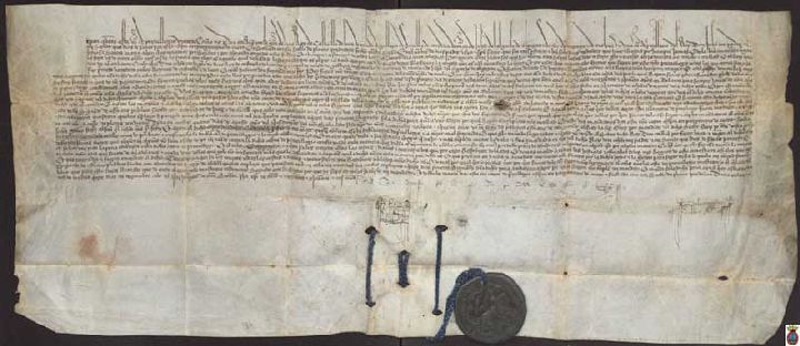 Pergamino con Real Sello de plomo pendiente. 61 x 26 cm. Deteriorado en aquellas partes por donde estaba doblado. Falta la S inicial del texto. A. M. de Mula. Carp. 1 de privilegios.