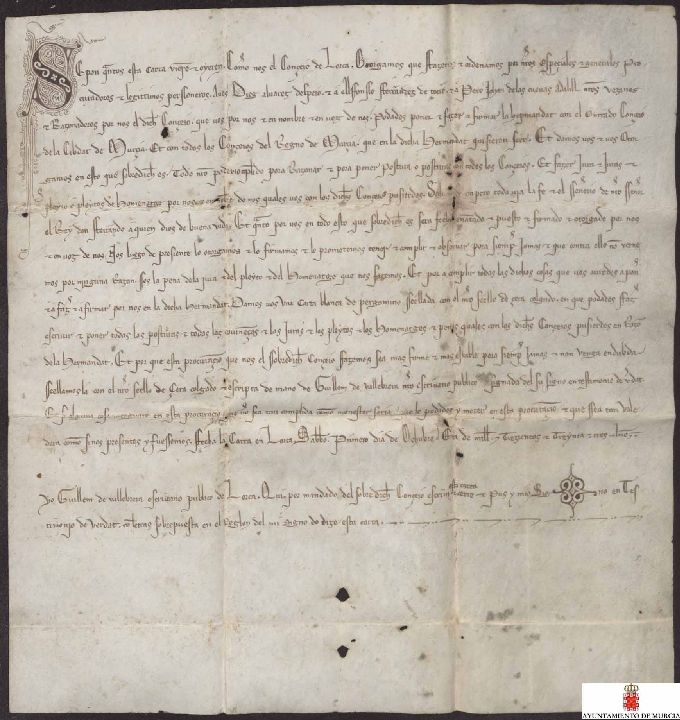 Carta del concejo de Lorca dando poder a Diego Fernández de Espejo, Alfonso Fernández de Torre y Pedro Juan de las Cuevas, para hacer hermandad con el de Murcia.