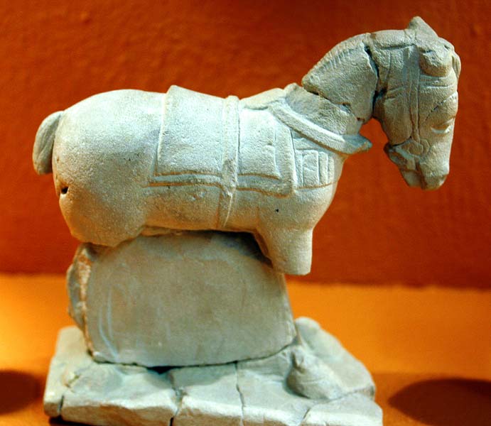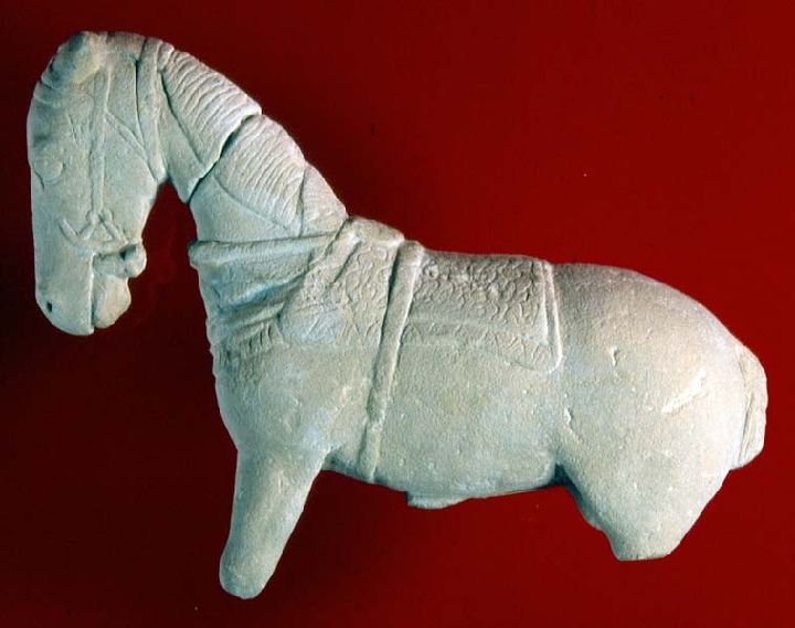Algunos caballos están representados individualmente, totalmente exentos y con el espacio situado entre las patas y cola vaciado, o bien, en bulto redondo. A su vez, este grupo de cerca de 80 piezas pueden ir sin atalajes o estar ricamente enjaezados. Encontró también yuntas, enjaezadas o no y un lote menor, compuesto por yegua con potro. No faltan pequeños bajorrelieves tallados por una o ambas caras con parejas de équidos y una pieza excepcional, en la que se ha labrado en un bajorrelieve un asno con su pollino.