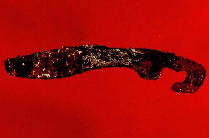 -Armas: Son escasísimas, únicamente aparecieron tres modelos. Concretamente un regatón de lanza, fabricado en hierro; un proyectil de plomo de forma bicónica, con los extremos apuntados, y, por último, una pieza interesantísima por su rareza en todo el ámbito ibérico.Se trata de una falcata de hierro realizada en miniatura. Presenta una empuñadura en forma de cabeza de caballo en la que parecen intuirse los remaches de sujeción para las cachas de madera o de hueso, que no se han conservado.