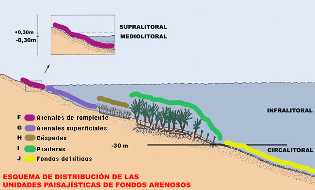 Es la unidad paisajística formada por la franja de playa influenciada por el oleaje. Cantos, guijarros, gravas y arenas finas son los componentes de este paisaje, pero el porcentaje con el que aparecen es diferente en cada una de las playas de nuestro litoral. Es la franja de playa por donde pasearemos si queremos no hundirnos mucho en la arena o si queremos mojarnos intermitentemente los pies con el ir y venir del oleaje, pero también es la franja de la playa donde nos bañaremos con la máxima seguridad. En ella podemos observar los últimos arribazones arrojados por el mar y la pequeña fauna que se alimentan de los mismo y vive enterrada en la arena.