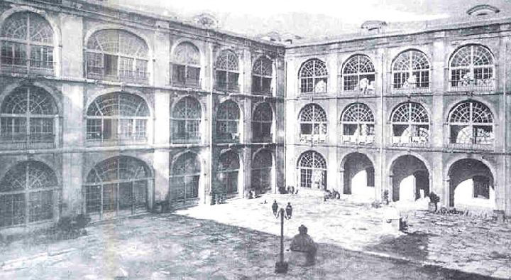 Los patios interiores son dos cuadrados perfectos, rodeados por unas galerías de siete grandes arcos de medio punto por lado, el central más ancho y plano. Las galerías recorren los tres pisos y son de altas bóvedas. Con el tiempo, los arcos se fueron cubriendo de ventanales acristalados. Actualmente, vuelven a estar descubiertos.
