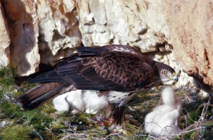 Los pollos son criados por la hembra, que comienza a alimentarlos inmediatamente después de su nacimiento. El procedimiento seguido es el típico entre las aves rapaces, mientras asegura fuertemente la presa con sus garras, arranca pequeños trocitos con su pico que presenta a sus polluelos.
