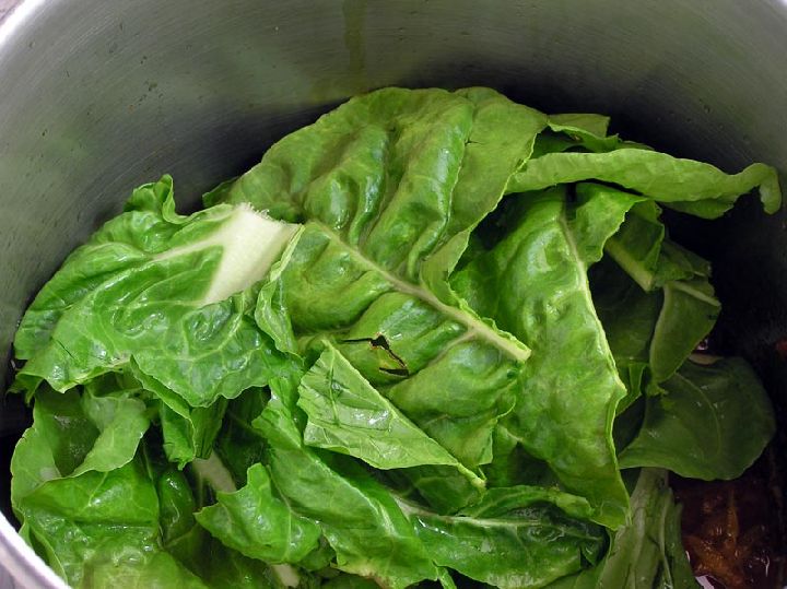 Cuando el sofrito, o requemado, está hecho se añaden los garbanzos, la patata en cortes y las acelgas, lavadas previamente y cortadas. Como en toda olla express se añadirá un poco de agua para la cocción.