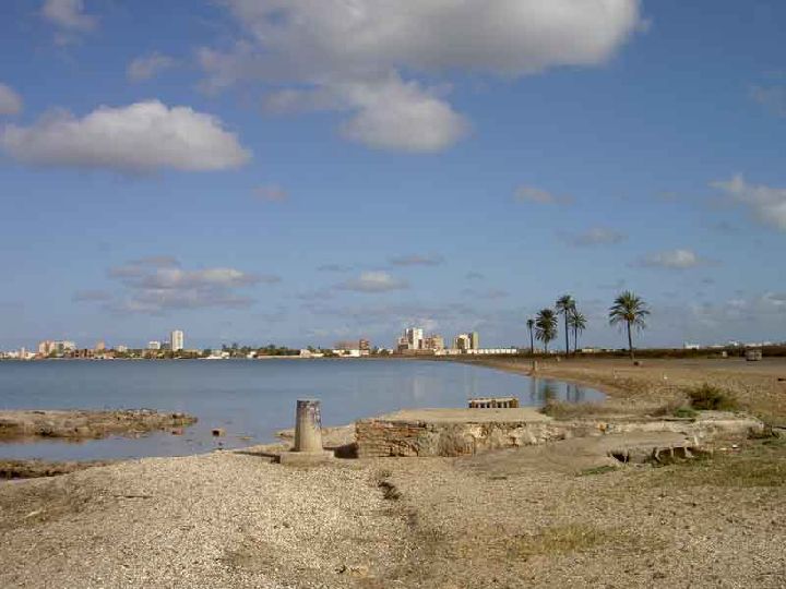 La Manga es una barra de arena de 22 kilómetros de longitud, y una anchura máxima de un kilómetro y medio, que casi cierra el contacto de la laguna con el Mar Mediterráneo.