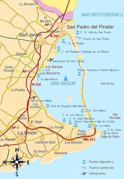 Además se puede encontrar hacia el Mediterráneo el único puerto comercial de la zona, el Puerto de San Pedro, situado en San Pedro del Pinatar, en el límite con Alicante.