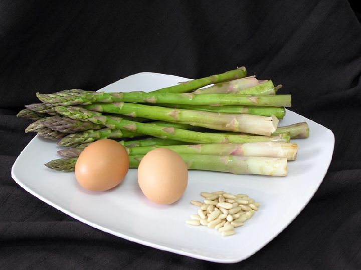 Las judías verdes con alcachofas, las alcachofas con huevo duro, la col cocida, la coliflor, las habas tiernas cocidas, etc. Cuando antiguamente los campos daban espontáneamente espárragos trigueros era frecuente que con ellos se preparara un hervido de espárragos con huevos escalfados. Hemos recuperado esta antigua receta de la Vega Media pero con espárragos verdes, un producto que está disponible todo el año en mercados y fruterías.