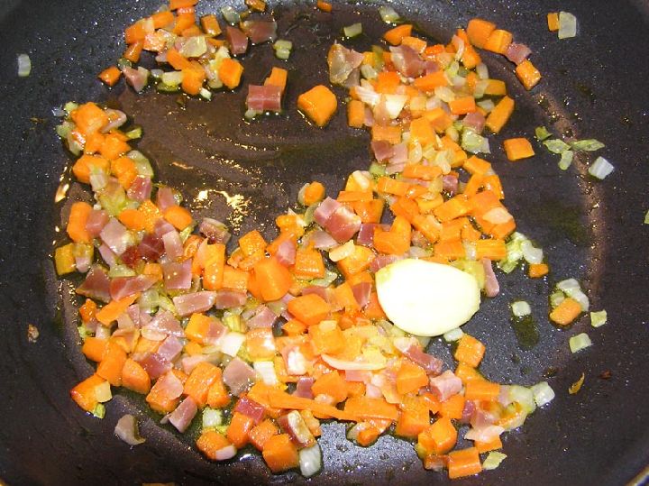 Después ponemos aceite en una sartén en la que freiremos ligeramente la cebolla y la zanahoria picadas. Cuando están sofritas añadiremos el ajo (entero o picado según el agrado de cada cual) y seguidamente el jamón y un poquito de harina que ayudará a espesar la salsa.