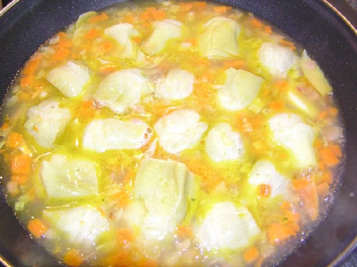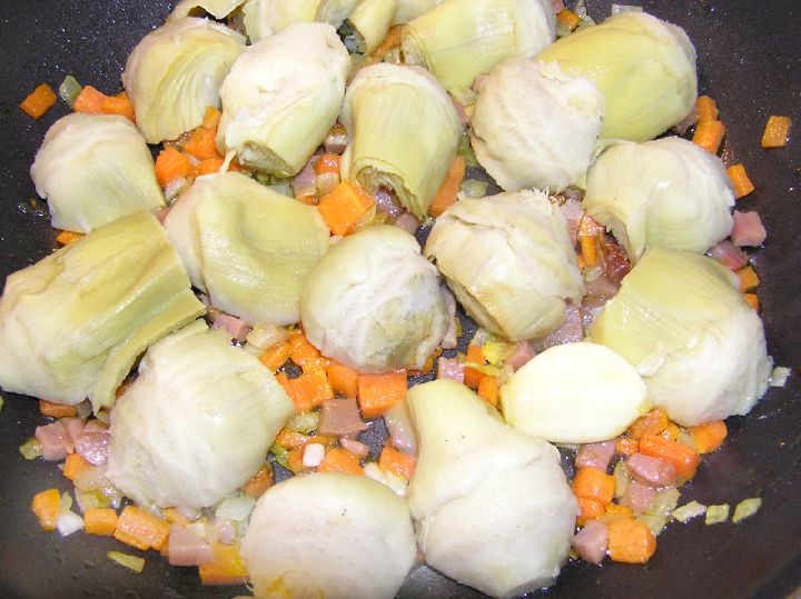 A continuación se incorporan el vino y las alcachofas escurridas y partidas por la mitad. Por último se añade una buena cantidad de caldo y dejamos reducir. Sólo nos queda esperar que la salsa espese.