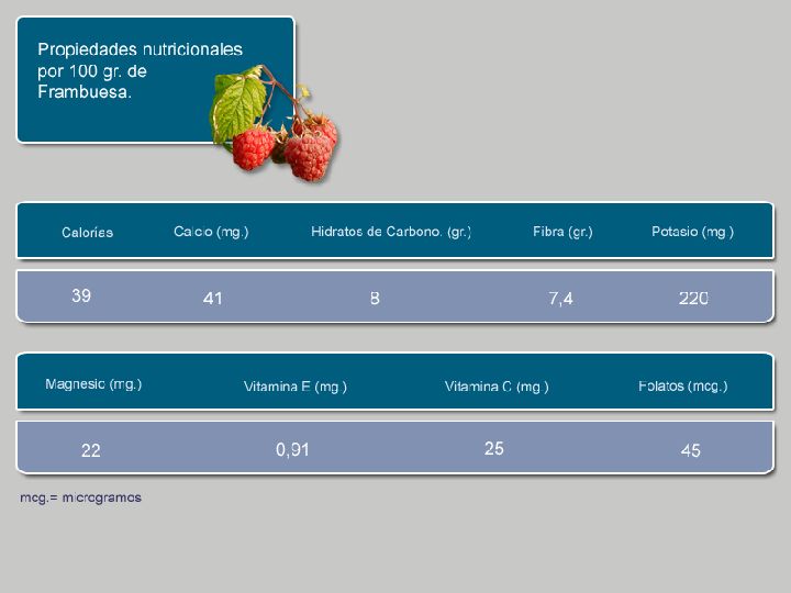 Fibra, vitamina y minerales son los principales aportes de la frambuesa al organismo. Entre las vitaminas destaca la presencia del grupo A (Carotenos), C (ácido cítrico), y del grupo B (folatos), con acción antioxidante y desinfectante.
