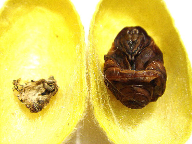 Metamorfosis: Una vez finalizado el tejido del capullo, el gusano realiza su metamorfosis pasando del estado de larva al de crisálida, que se produce a los 12 o 14 días hasta que emerge la mariposa.
