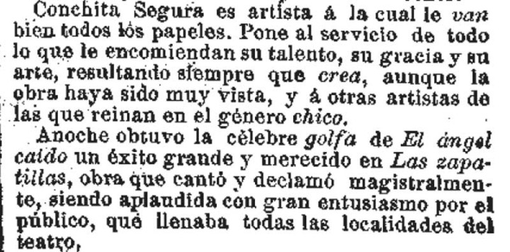 El Globo, 20 de octubre de 1897 (tras la representación de Las Zapatillas) “Conchita Segura es artista a la cual le van bien todos los papeles. Pone al servicio de todo lo que le encomiendan su talento, su gracia y su arte, resultando siempre que crea, aunque la obra haya sido muy vista, y a otras artistas de las que reinan en el género chico”