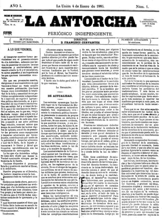 El 4 de enero de 1885 salió a la luz el primer número de La Antorcha, un semanario dominical dirigido por el abogado Francisco Cervantes Gallardo. La Antorcha se declaró independiente, aunque, al igual que El Faro Unionense, fue anticlerical y defendió con vehemencia la corriente librepensadora. La contundencia de sus aseveraciones le llevó a tener varios enfrentamientos con El Diario de Murcia. La Antorcha también fue un periódico informativo. Entre sus contenidos destaca la cobertura de los actos que se produjeron con motivo de la inauguración de la plaza de toros de La Unión, a finales de enero de 1885. Este semanario publicó su último número el 30 de abril de 1885.