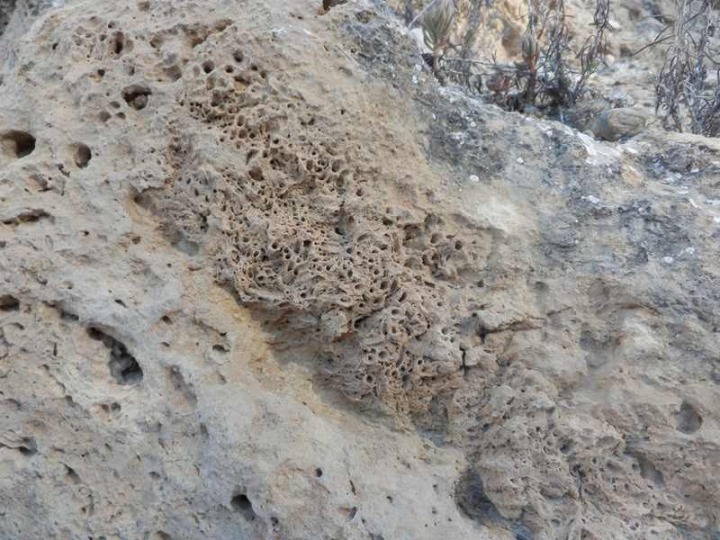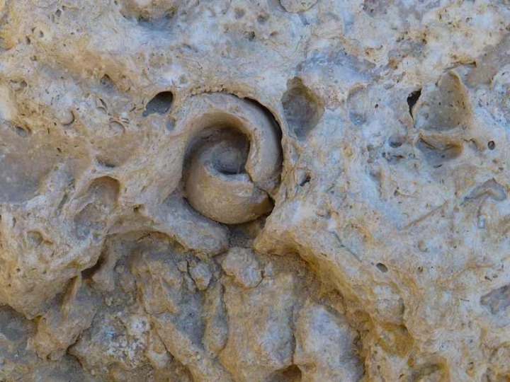 A veces la Rambla de Librilla ha dejado en su cauce interesantes bloques procedentes de su cabecera. Un bloque rodado de coral que incluye un fósil de gasterópodo