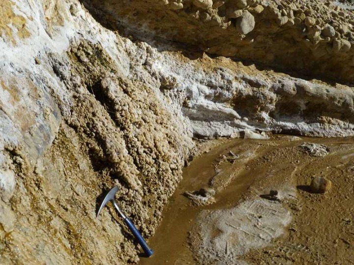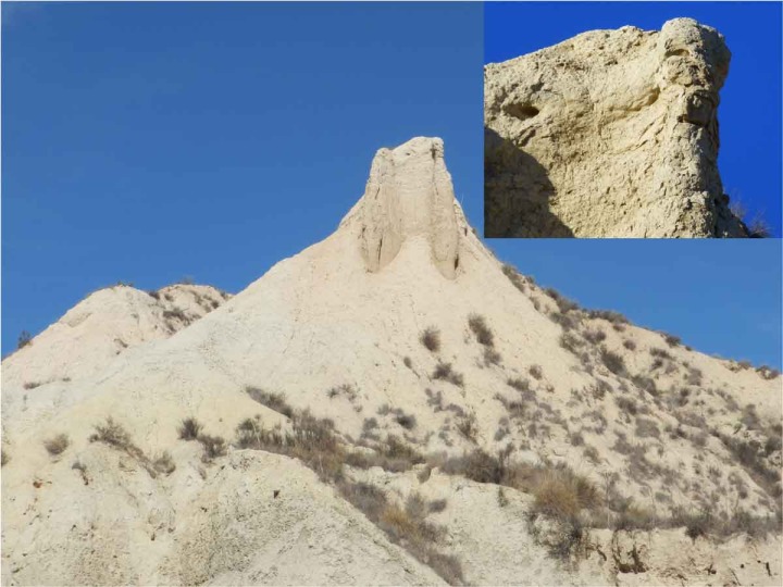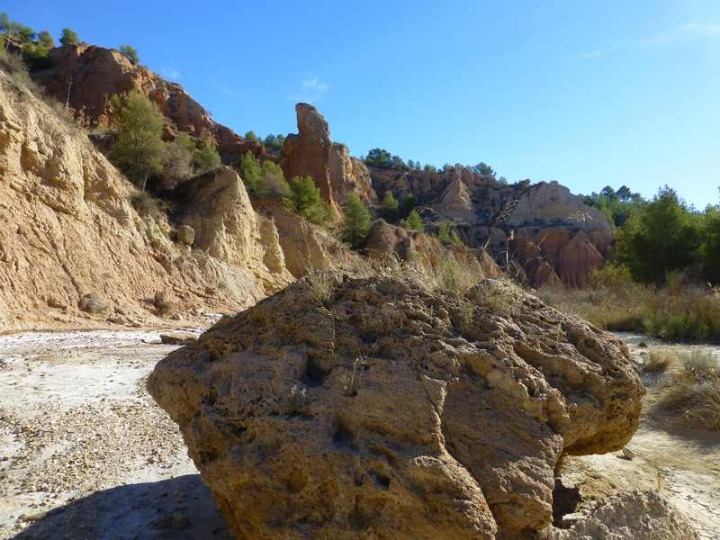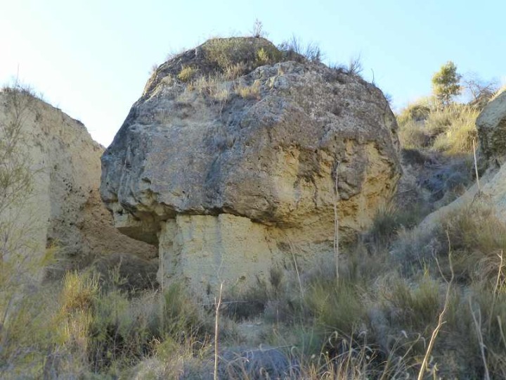 Bloque de travertino que recuerda a un champiñón producido en un extinto manantial en el contacto de rocas detríticas con las margas inferiores