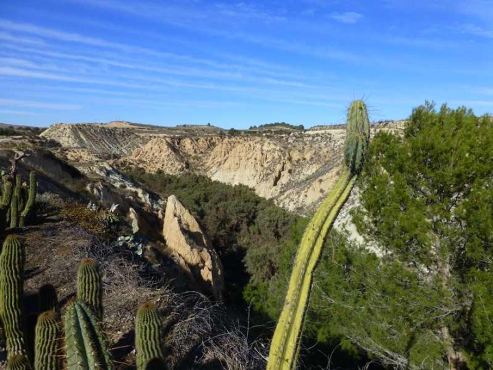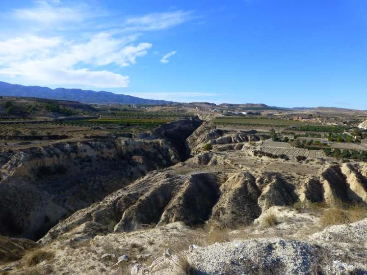 Ya en Fuente Librilla, la rambla homónima se estrecha y se encaja en el glacis que cubre gran parte de la llanura. Al fondo cerros originados por antiguos arrecifes de coral