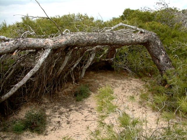 Las dunas de la Playa de la Torre Derribada tienen una altura superior a 3 m, y entre estas y las charcas salineras se localizan los saladares y juncales. La playa está sometida a continuos cambios debido al aporte de materiales arrastrados por las olas y el viento.