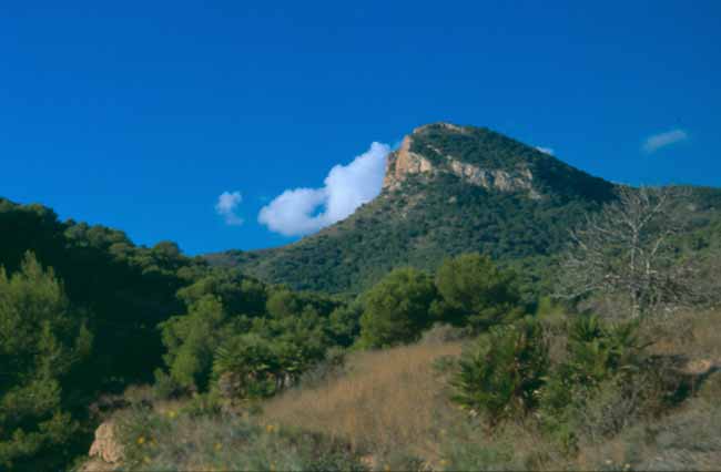 En las laderas orientadas al sur el pinar desparece, sustituyéndose por un manto de matorral y arbustos salpicado de ejemplares aislados de pino carrasco retorcidos y de porte casi horizontal debido a la acción del viento. Al pinar se asocia el típico sotobosque de pinar mediterráneo formado por especies vegetales como el palmito, la coscoja o el espino negro.