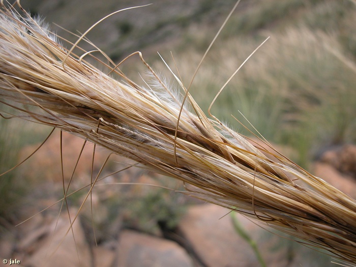 Arbusto perenne, herbáceo, alto, robusto, que forma macollas o "atochas" de hasta 1,5 (2) m de diámetro. Hojas numerosas, lineares y muy largas replegadas sobre si mismas, de aproximadamente 100 x 0,5 cm. Inflorescencia con espiguillas de 3-3,5 cm de longitud, agrupadas en panícula terminal compacta, con aspecto de espiga. Arista espiralada, de extremo truncado. Fruto seco, en cariopside, pelos y aristas persistentes en la fructificación.