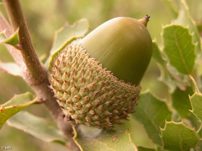 Arbusto perennifolio, de follaje denso y ramificación muy intrincada, con las ramas algo punzantes, que puede alcanzar hasta 3 metros de altura. Hojas ovadas, con márgenes provistos de espinas, alternas, pecioladas, de 1,5 a 4 cm de longitud y color verde brillante, lampiñas. Flores poco vistosas, agrupadas en amentos, los masculinos bastante alargados. Fruto en bellota, muy amarga, con cúpula cubierta de escamas largas y rígidas, patentes.