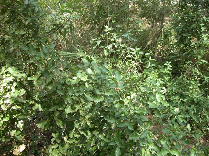 El matorral denso de coscojas, los coscojares, han sido denominados también como garriga, una formación vegetal característica de la cuenca mediterránea que resulta de la degradación de bosques maduros de encina. En el termomediterráneo semiárido murciano estos matorrales se presentan aún más degradados, por lo que los coscojares o la garriga, paradójicamente, quedan relegados a sotobosques de pinares cálidos, algo húmedos y umbríos, como los que se dan en la Sierra de la Pila, Sierra Espuña, etc.