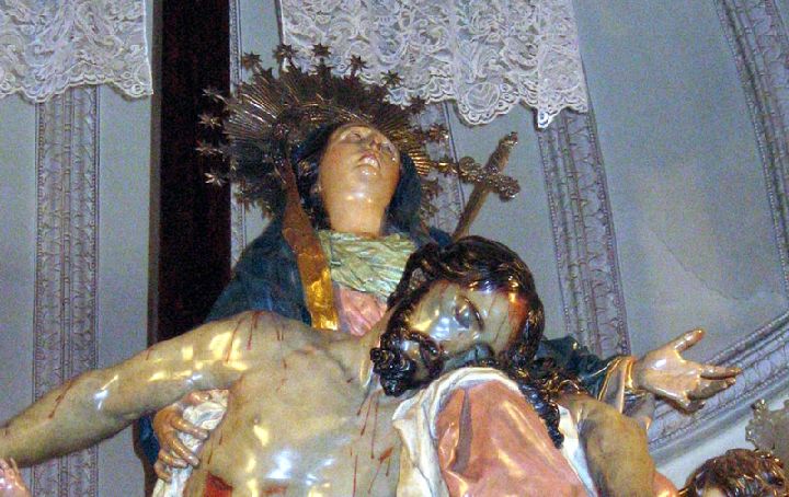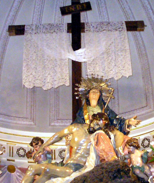 La Virgen como madre sobrecogida por un intenso dolor causado por la violenta muerte de su hijo, dirige su vista hacia el cielo mientras que con su antebrazo derecho sostiene el cuerpo yaciente de su hijo. El Cristo muerto es de gran belleza, perfección anatómica y lograda policromía, así como los angelitos que le besan las manos y heridas.