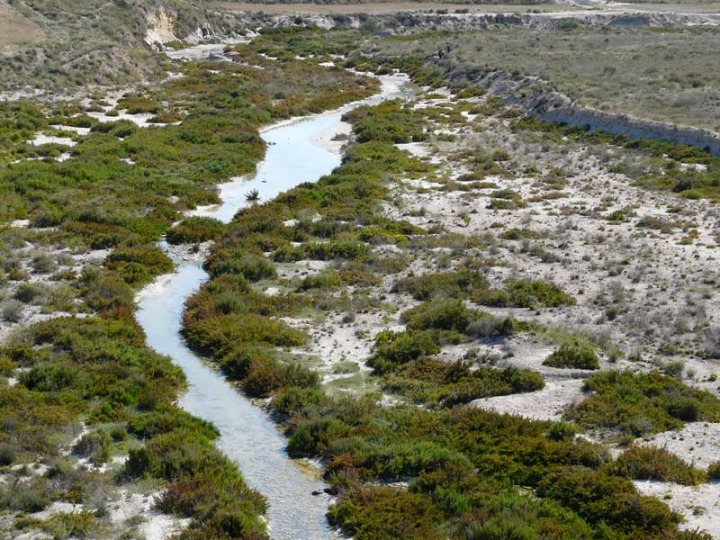 Por otro, se necesitan también lluvias torrenciales e irregulares, que dan lugar a una cubierta vegetal escasa, fruto también de la aridez y de cierta infertilidad del suelo. Lo que conduce a generar "bad-lands", zonas exportadoras de agua, sedimentos y sales, que generan flujos hidroquímicos que producen acumulaciones de sedimentos arcillosos y encharcamientos de aguas salinas en las depresiones existentes en las llanuras de inundación de ramblas, constituyendo la base para la organización, funcionamiento y dinámica de la mayor parte de los saladares de interior murcianos.